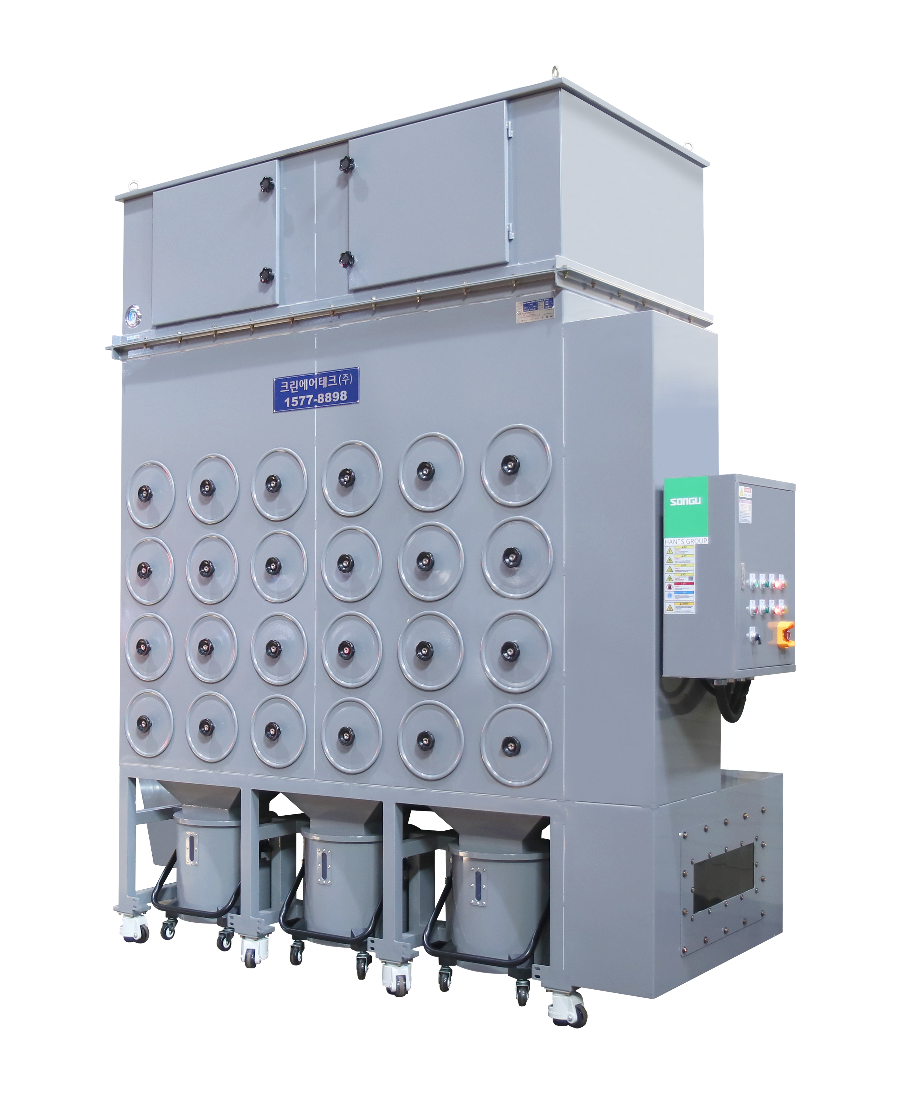 하향기류방식의 집진기로서 스틸, 스테인리스 등의 플라즈마·레이저 가공 시 대량으로 발생하는 퓸(Fume, 연기) 제거에 특화된 에어펄스 집진기입니다.